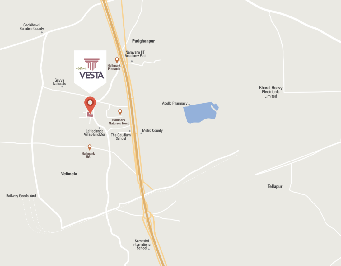 Hallmark Vesta has been designed to be in one of the most serene yet now-growing locales of twin-cities. This residential has been planned in the region of Pati, which is at a short distance, off Kollur. Adding to your pleasure, you will be at appropriate distances from the Financial District and ITIR. Besides, the essentials of life like the best of schools, colleges, entertainment, conveniences like supermarkets and workplaces sectors will be near to you.