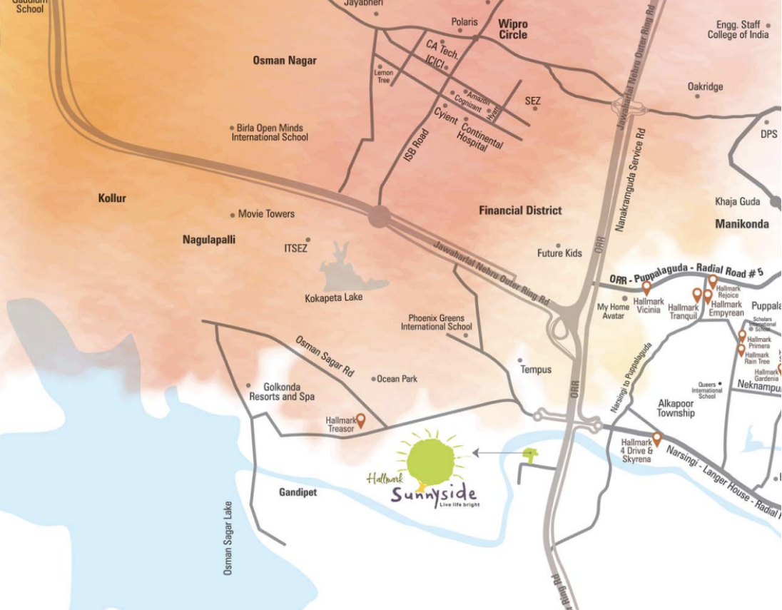 Sunnyside is at a location that’s easy to reach and commute to. Easy-reach is that’s easy to reach and one of the several advantages here. Sunnyside is very close to Gandipet and in the vicinity of Outer Ring Road, keeping you at short distances to places essential.